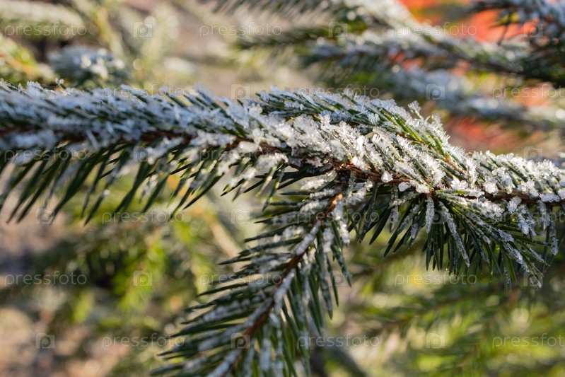 Ветки ели обыкновенной покрыты утренним инеем на естественном фоне. крупным планом