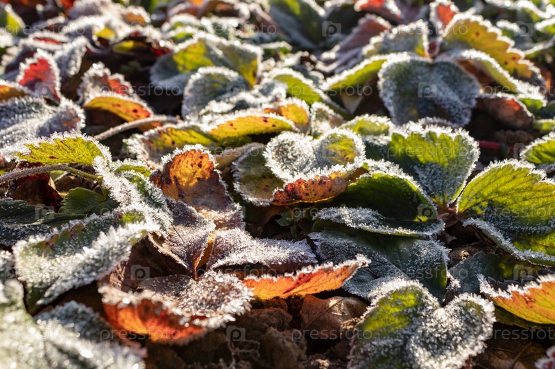 Листья клубники, покрытые инеем в первые осенние заморозки, абстрактный естественный фон. зеленые листья растений, покрытые инеем, вид сверху. Поздняя осень, концепция мороза
