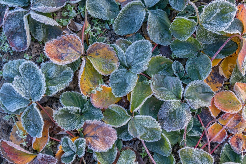 Морозное ноябрьское утро. красно-зеленые и желто-розовые листья клубники покрыты белым льдом. крупным планом