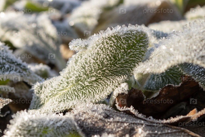 Листья, покрытые инеем в первые осенние заморозки, абстрактный естественный фон. зеленые листья растений, покрытые инеем, вид сверху. Поздняя осень, концепция мороза