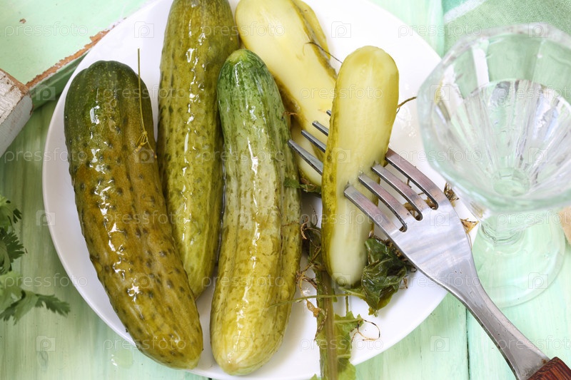 Малосольные огурцы с водкой на зеленом фоне