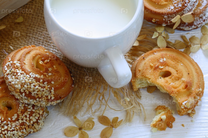 Натюрморт с печеньем и молоком на белом фоне