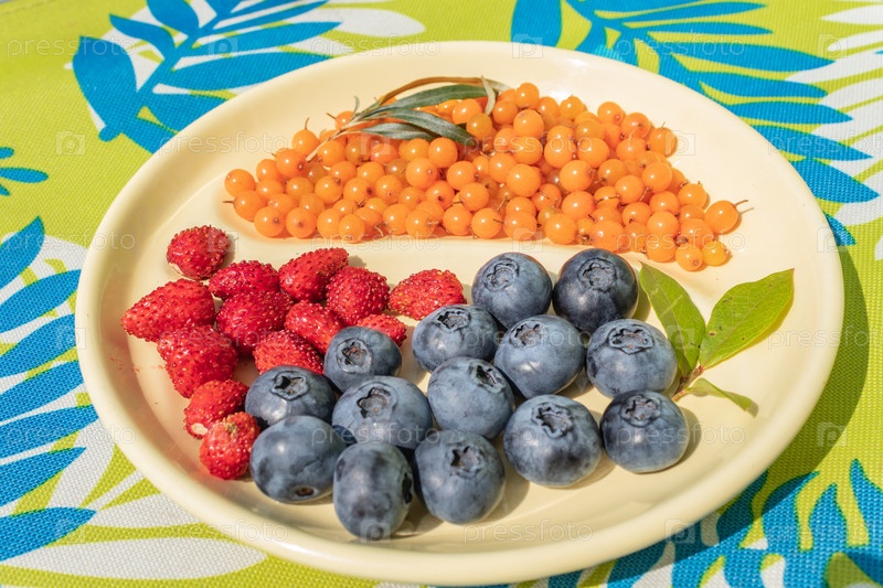 Собранные на участке спелые ягоды черники и облепихи. Красочная и здоровая концепция. крупным планом