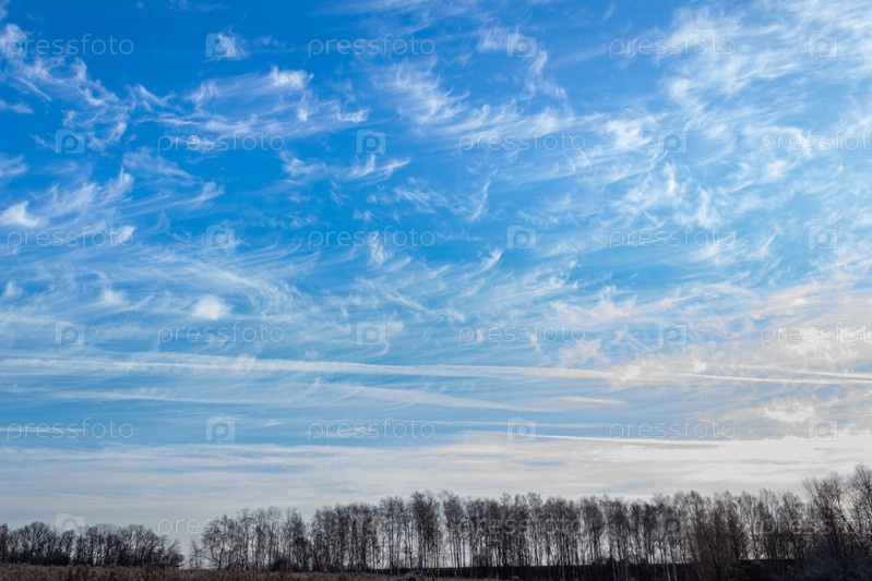 Тонкие белые перистые облака на фоне голубого неба, поздняя осень. Тульская область, Россия