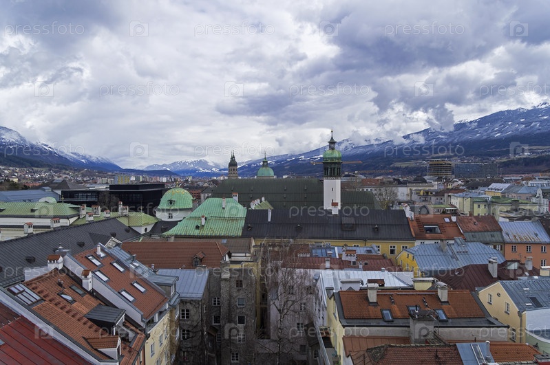 Вид с верхушки старой часовой башни на исторический центр Инсбрука и окрестные горы. Австрия