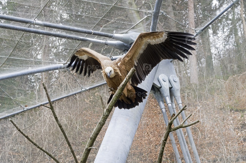 Белый сип (лат. Gyps fulvus) раздвинул крылья, сидя на ветке дерева Alpenzoo (Альпийский зоопарк)