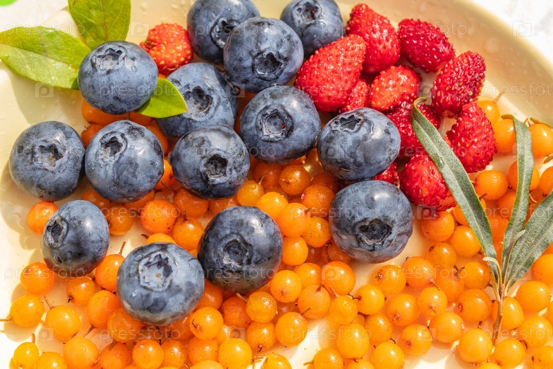 Собранные на участке спелые ягоды черники и облепихи. Красочная и здоровая концепция. крупным планом