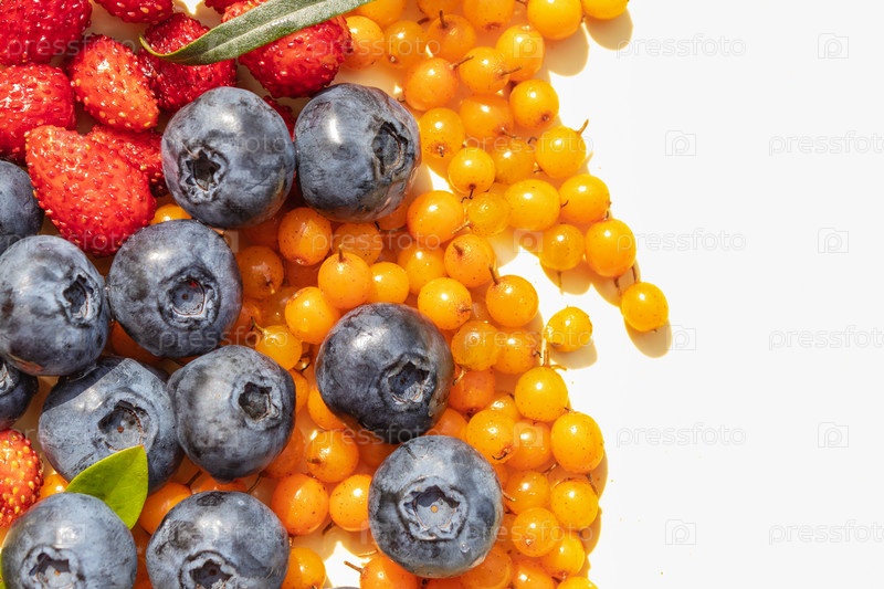 Собранные на участке спелые ягоды черники и облепихи. Красочная и здоровая концепция. крупным планом