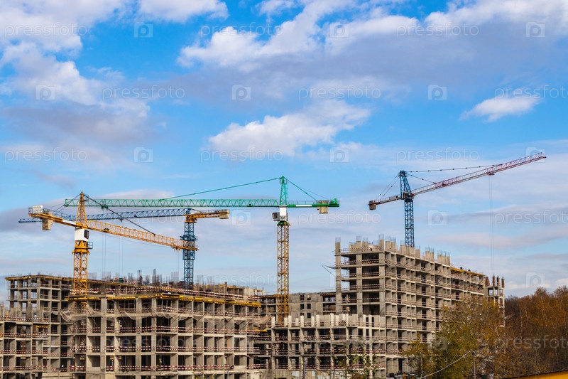 Строительство третьей очереди нового жилого комплекса «В лесу». Работа строительных кранов, идет возведение стен зданий. Москва, Россия