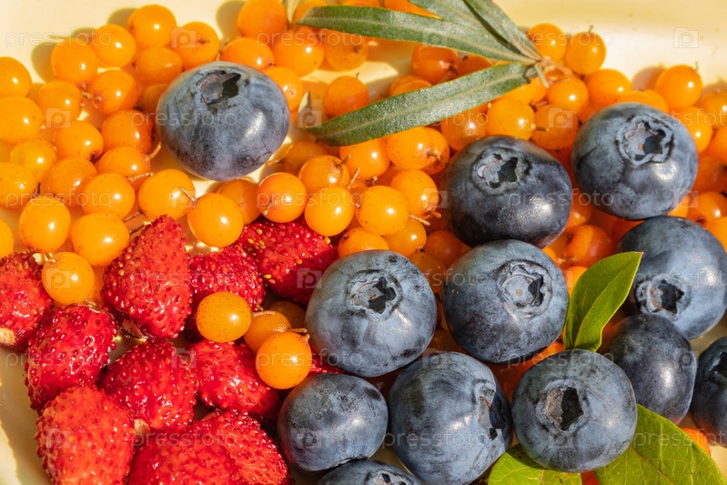 Собранные на участке спелые ягоды черники и облепихи. Красочная и здоровая концепция. крупным планом