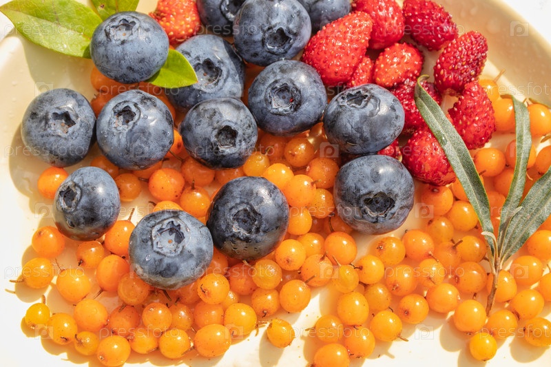 Собранные на участке спелые ягоды черники и облепихи. Красочная и здоровая концепция. крупным планом