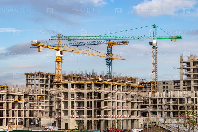 Строительство третьей очереди нового жилого комплекса «В лесу». Работа строительных кранов, идет возведение стен зданий. Москва, Россия
