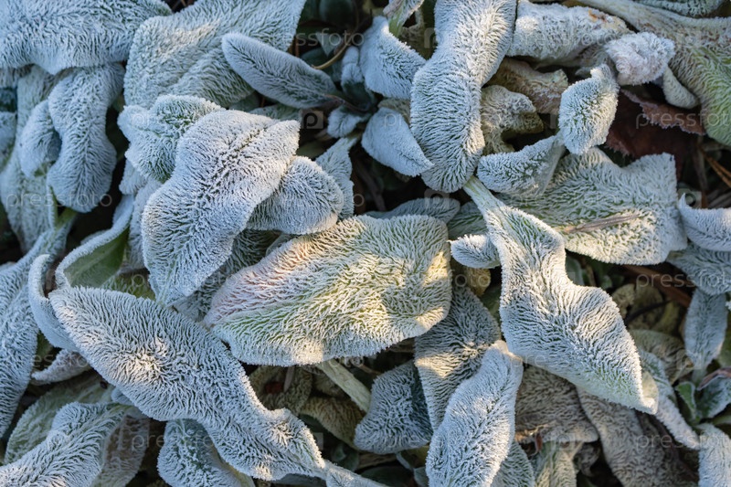 Листья, покрытые инеем в первые осенние заморозки, абстрактный естественный фон. зеленые листья растений, покрытые инеем, вид сверху. Поздняя осень, концепция мороза