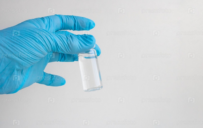 Рука в синей перчатке держит бутылку с вакциной. Концепция коронавируса, медицины и лекарств