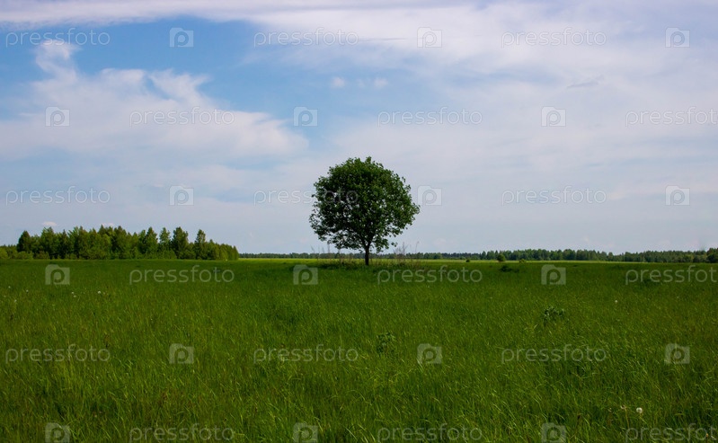 Красивый летний пейзаж с одним зеленым деревом, стоящим в зеленом поле