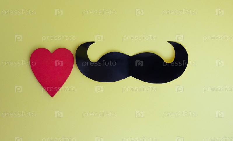Концепция Дня отца. Черные усы и красное сердце на фоне желтой бумаги