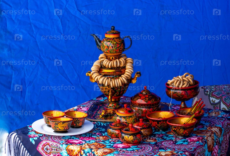 На столе на красочной скатерти стоит традиционный русский самовар. Русская национальная чайная церемония