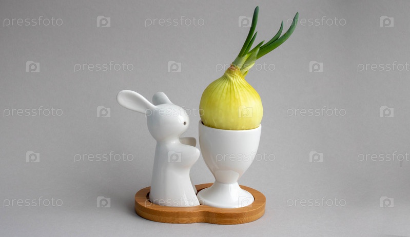 Пасхальный кролик на деревянной подставке с луком на сером фоне. Концепция праздника Пасхи