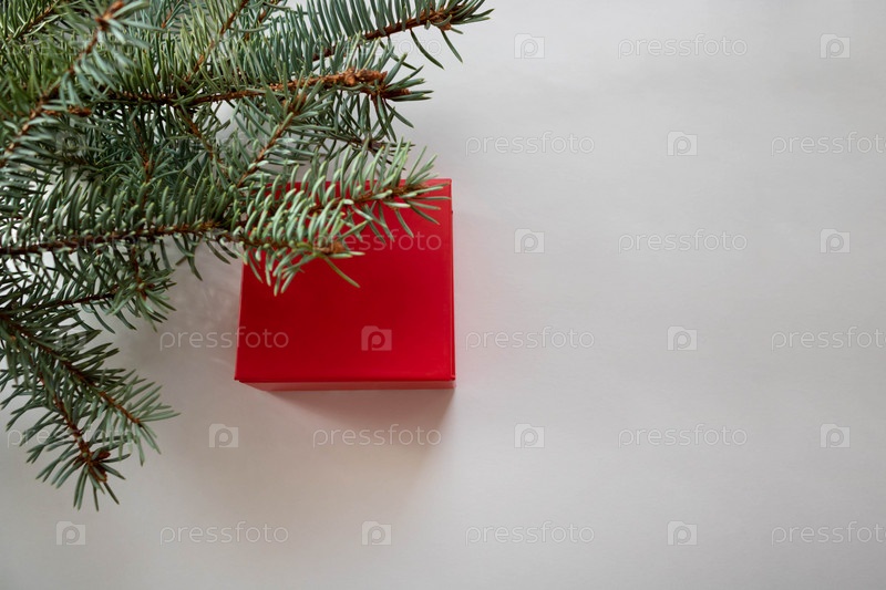 Натуральные еловые ветки с красной подарочной коробкой на белом фоне. Место для вашего текста