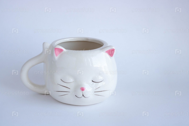 Белая кофейная кружка в виде кошки с розовыми ушами, крупным планом на белом фоне. место для текса