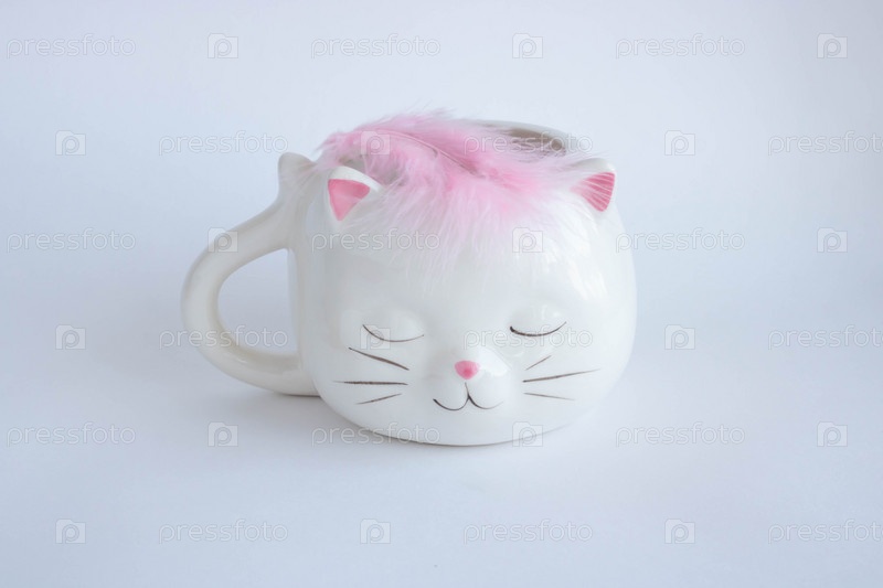 Белая кофейная кружка в виде кошки с розовыми ушами, крупным планом на белом фоне