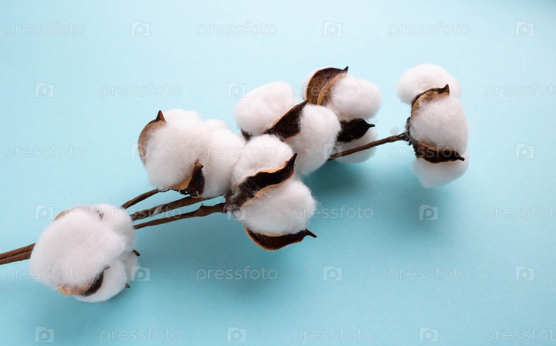 Красивые белые цветы хлопка на синем фоне. Хлопковая промышленность. Концепция Пасхи. Оформление сухого букета
