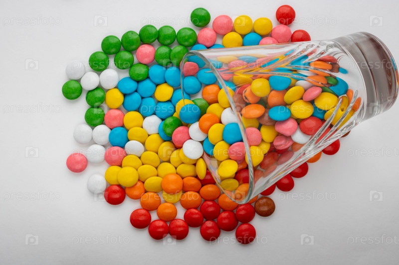 Стеклянный стакан на красочном абстрактном фоне конфет, копия пространства. Очаровательная текстура. Вид сверху, плоская лежащая