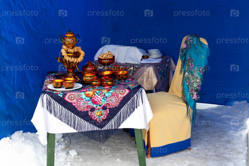 На столе на красочной скатерти стоит традиционный русский самовар. Русская национальная чайная церемония