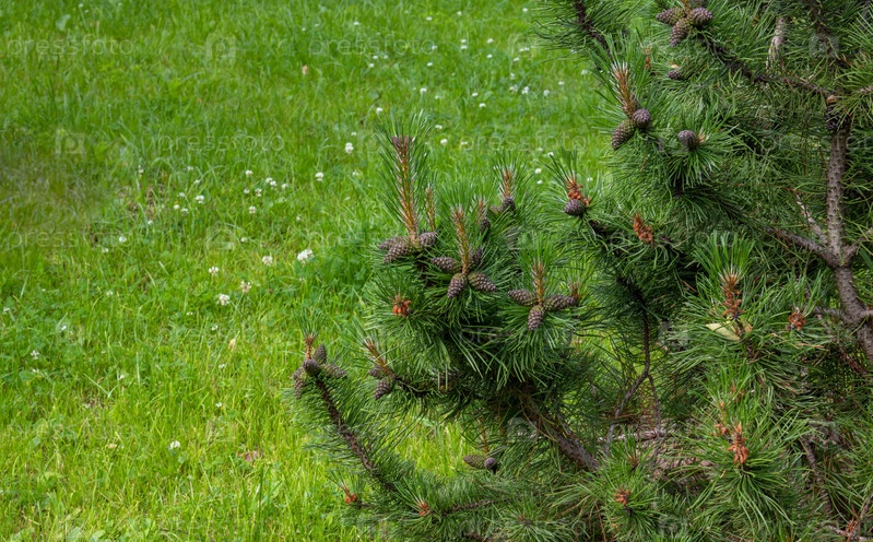 Сосновые шишки на ветке. Молодая зеленая закрытая шишка на сосне в дикой природе в лесу. Сосновая шишка крупным планом