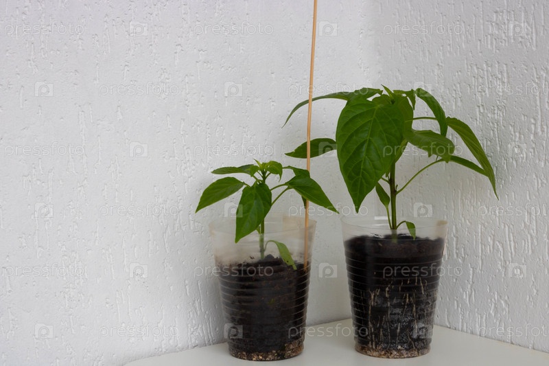 Рассада болгарского перца с хорошо развитой корневой системой на белом фоне. Корень и стебель, листья рассады перца