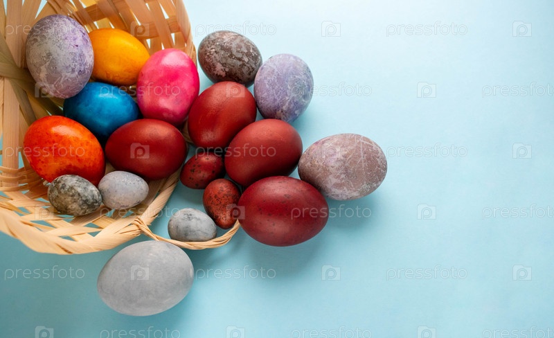 Красочные яйца высыпались из корзины. Концепция Пасхи