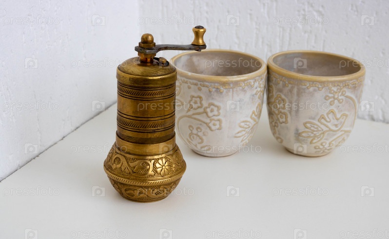 Старая бронзовая кофемолка стоит на белом фоне рядом со старинными чашками