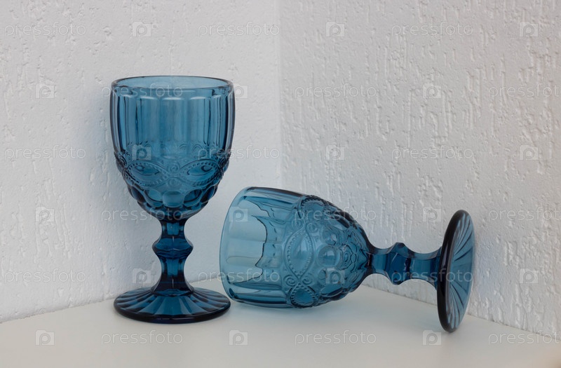Два синих граненых хрустальных бокала стоят на белом фоне