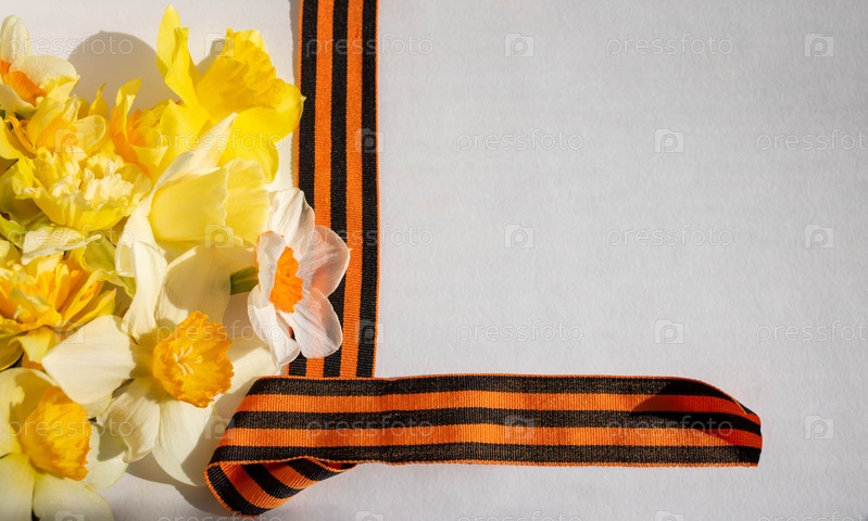 Нарциссы и георгиевская лента на белом фоне. Георгиевская лента – символ Великой Победы
