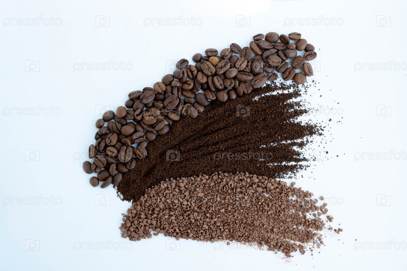 Фон из жареных кофейных зерен, гранулированного цикория и молотого кофе. Фон из кофейных зерен и кофейного порошка