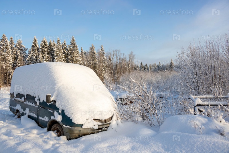 Фургон автомобиля, покрытый глубоким слоем белого снега, с копией пространства