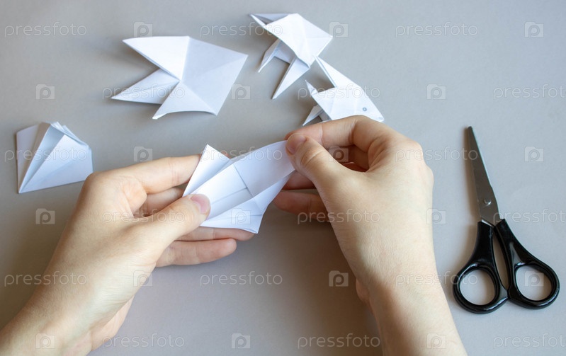 Руки делают белую бумажную рыбу на сером столе. Рядом с ним ножницы