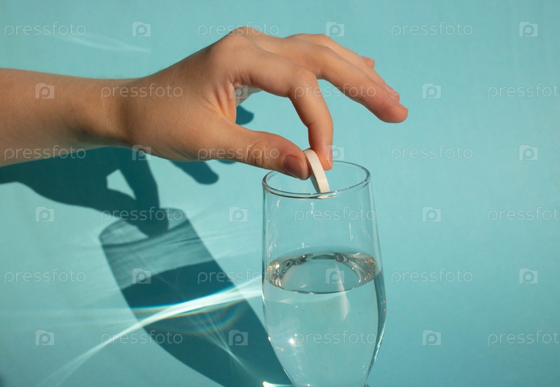 На синем фоне рука бросает растворяющуюся шипучую таблетку аспирина в стакан с водой