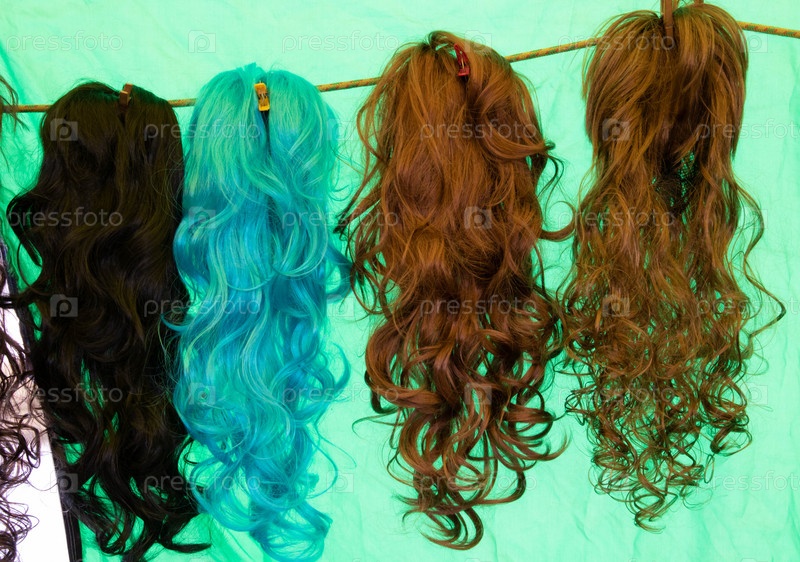 Цветные парики с длинными волнистыми искусственными волосами, свисающие рядом друг с другом