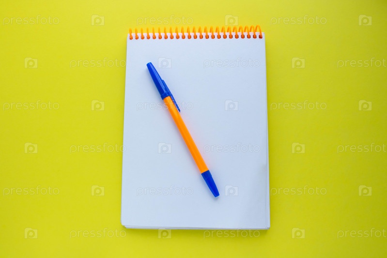 Блокнот с оранжевой спиралью и оранжевой ручкой на желтом фоне. пространство для копирования вид сверху