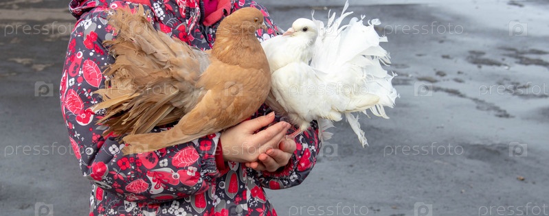 Детские руки держат домашних голубей белого и коричневого цвета
