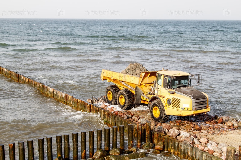 Тяжелый грузовик во время строительства волнореза у моря в осенний день