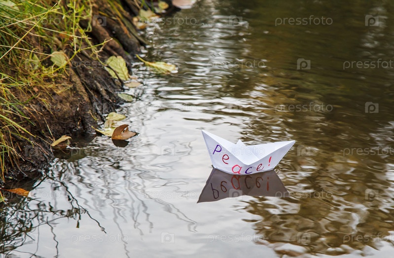 Одинокая белая бумажная лодка под названием «Мир», плывущая по ручью
