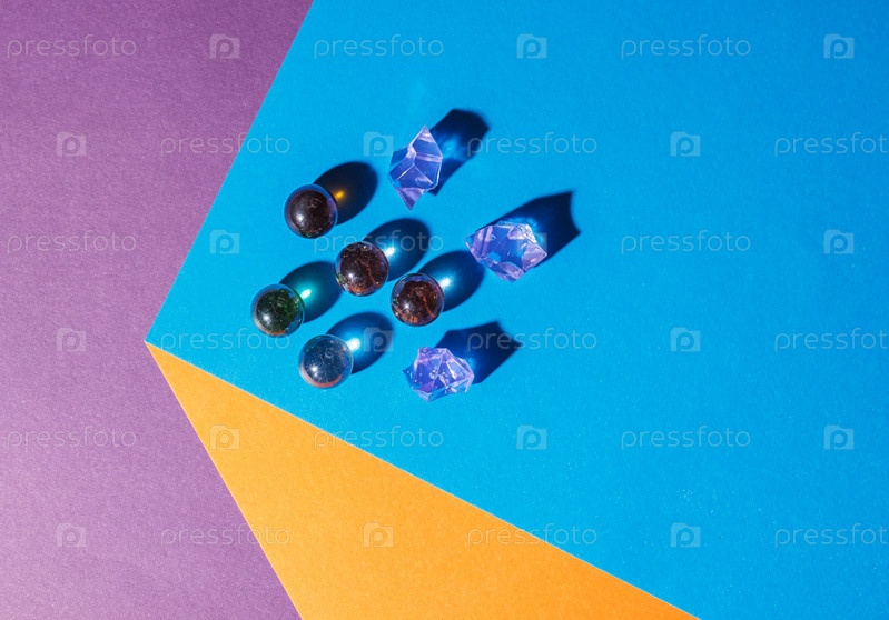 Разноцветные стеклянные шарики и голубые кристаллы на столе в помещении крупным планом