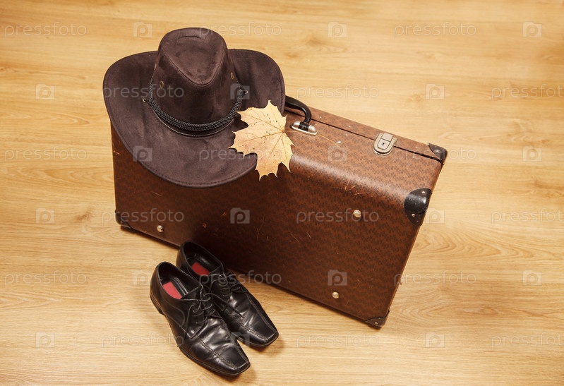 Комплект из мужской фетровой шляпы с желтым кленовым листом, черных туфель и чемодана