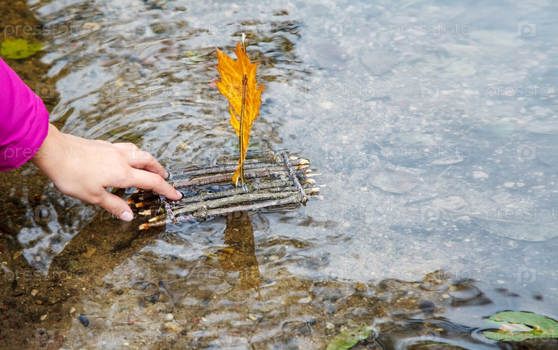 Девочка кладет деревянный маленький игрушечный плот ручной работы в