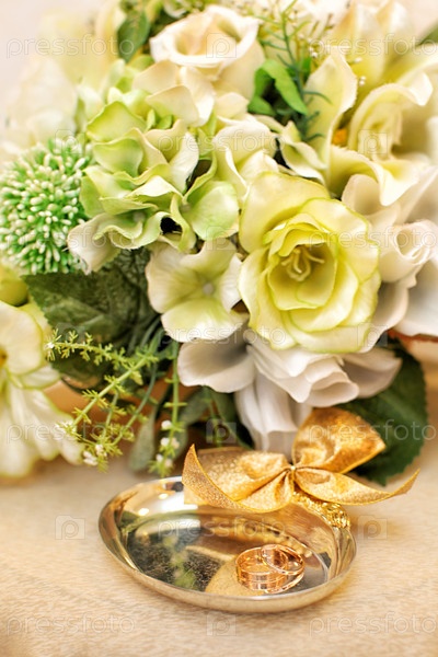 Букет невесты и обручальные кольца на столе
