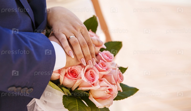 Руки жениха и невесты с кольцами и букетом роз