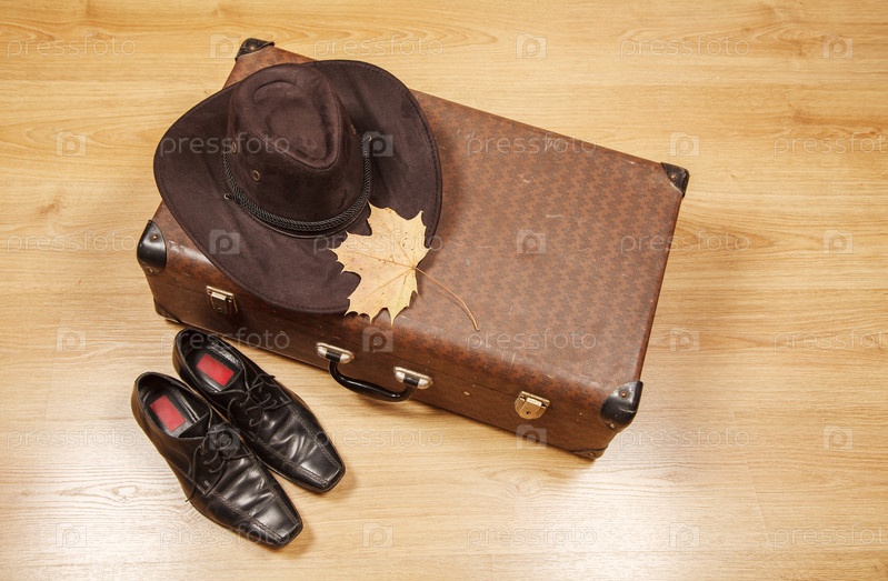 Комплект из мужской фетровой шляпы с желтым кленовым листом, черных туфель и чемодана