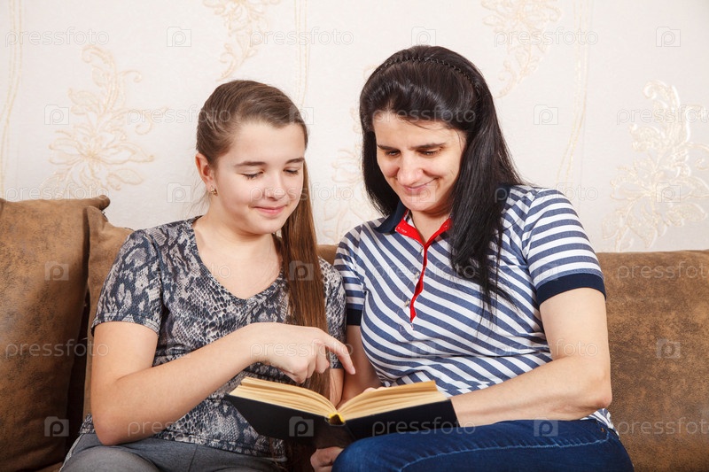 Мама и дочь читают книгу, сидя на диване